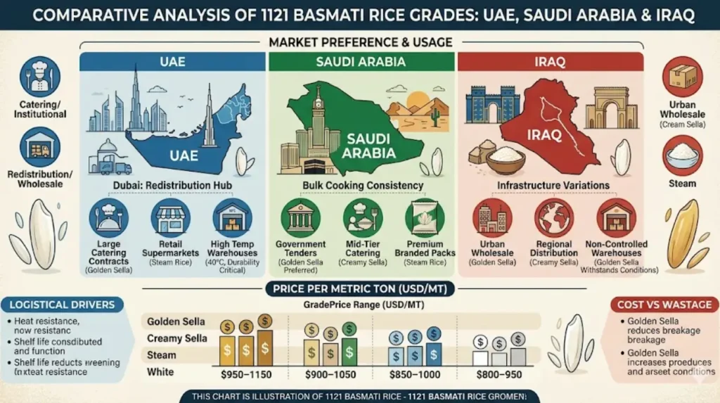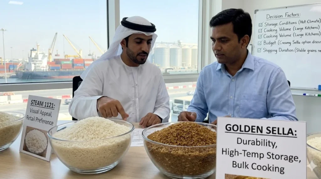 Climate, storage conditions, cooking volume, and price sensitivity determine the correct 1121 Basmati grade selection for UAE, Saudi Arabia, and Iraq buyers.