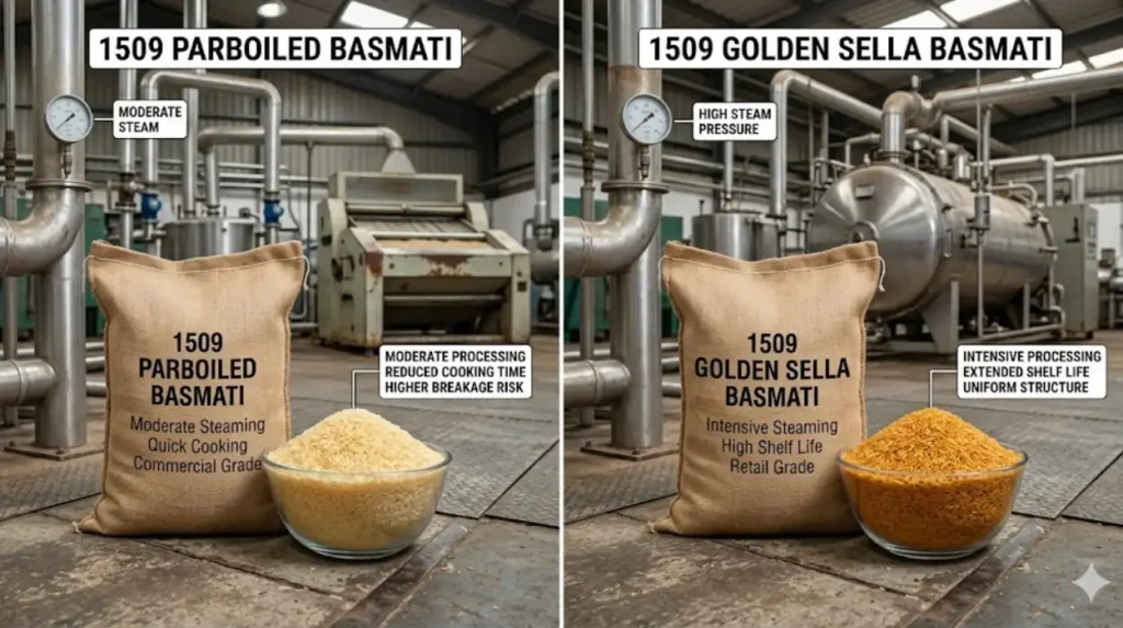 1509 Golden Sella offers longer shelf life and stronger grains, while 1509 Parboiled provides faster cooking and softer texture. Golden Sella undergoes deeper parboiling, which hardens the grain and improves durability. Parboiled rice retains more moisture, which reduces cooking time but shortens storage life.