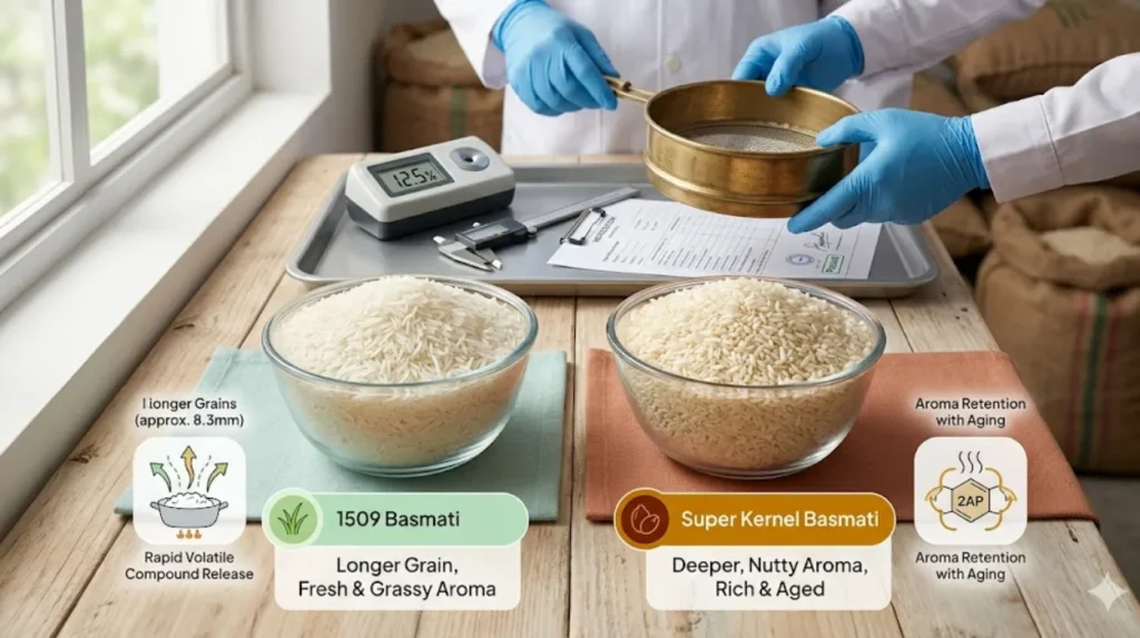 In this analysis, the comparison focuses on aroma chemistry, processing methods, market preferences, and trade outcomes. For foundational understanding of 1509 specifications and export positioning, refer to this detailed guide on how exporters position 1509 basmati across Asia and beyond.