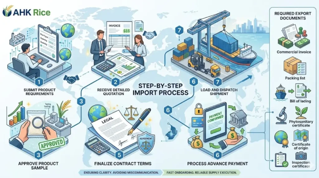 Buyers must evaluate product quality before bulk orders. AHK Rice provides a structured sampling process.