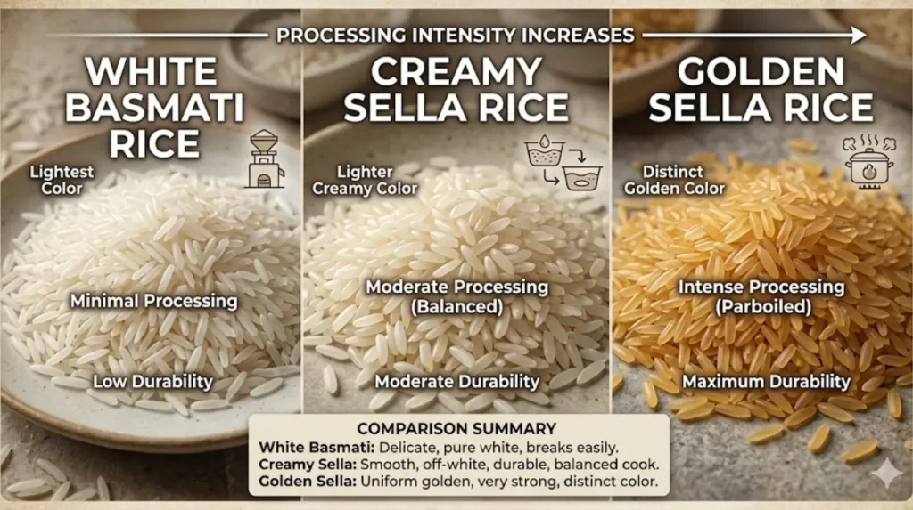 White rice undergoes no parboiling. Creamy sella undergoes partial parboiling. The difference affects cooking strength and shelf life. Creamy sella resists breakage better.