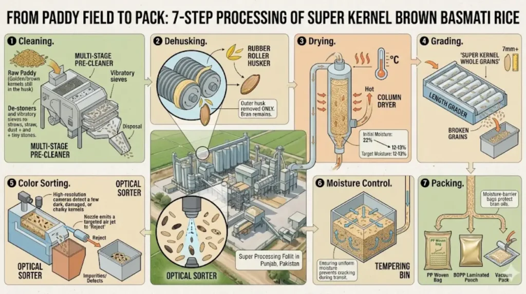 Processing begins with harvested paddy. Each step preserves grain integrity and prevents nutrient loss. Brown basmati skips polishing, which defines its wholegrain status.
