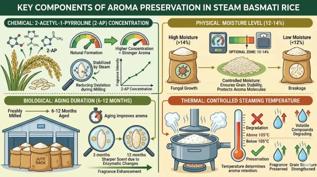 Four components control aroma preservation: 2-acetyl-1-pyrroline concentration, moisture level at 12–14%, aging duration of 6–12 months, and controlled steaming temperature below 105°C.